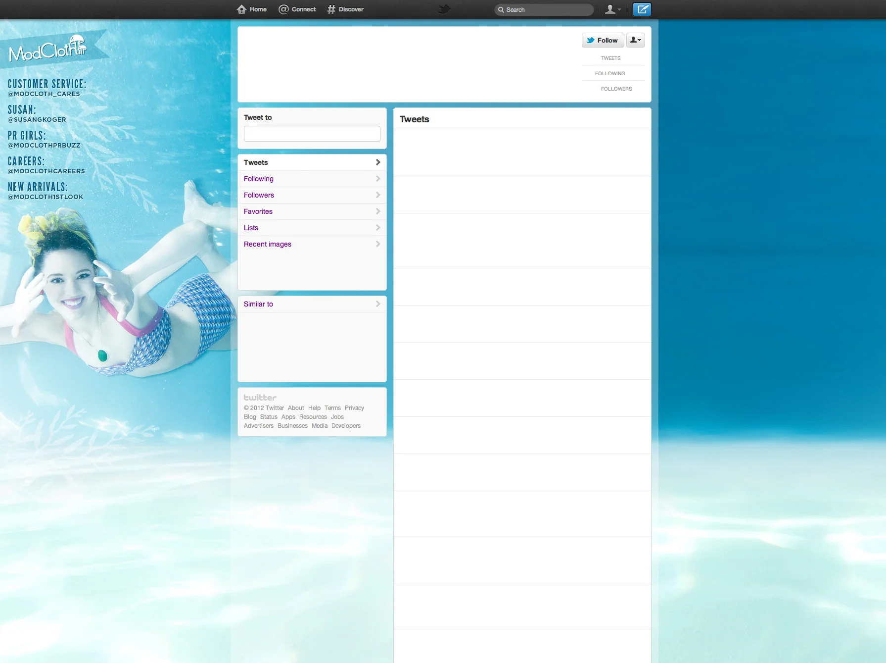 This is an example of Homepage hero graphics which changed weekly, and the representation that lasted the full month on Twitter. Note that this required clever design to support the design restraints on Twitter. This campaign gained ModCloth recognition as one of the top brand pages on Twitter.